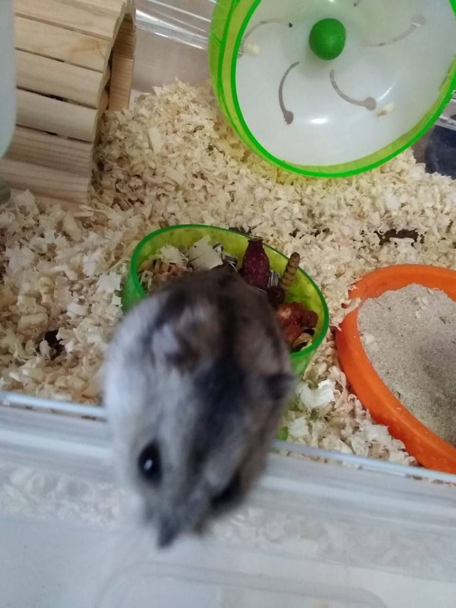 Всем здравствуйте. Хомка очень любит погрызушки грызть и суваться в камеру. А потом еще хомка пугливая. И чуть-чуть злая. Эта хомка дикая. Но иногда залезает на руку.