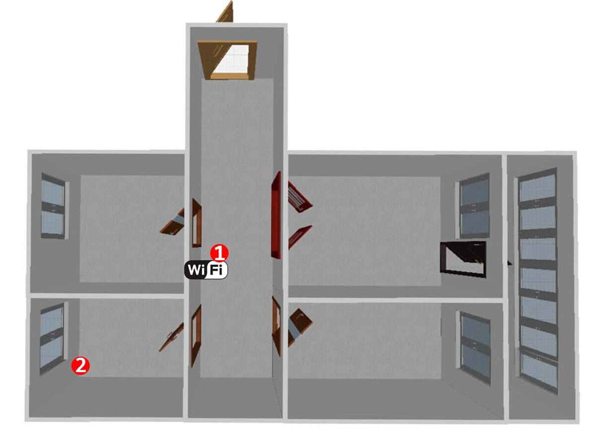 Вначале хочу напомню план квартиры и точки (красные круги 1 и 2) в которых проводилось тестирование, знаком WiFi обозначено место расположения HUAWEI AX3 WiFi 6.