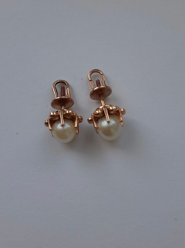 Вот такие невероятно красивые серьги-пуссеты из золота 583 пробы делали в СССР изготовлены на Ленинградском заводе. Жемчуг сейчас в моде, поэтому смело можете носить их вместе с нежной рубашкой.
