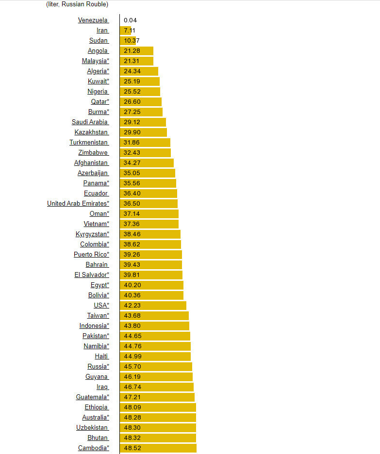 Россия в этом списке на 35 месте с ценой 45 руб за литр.
