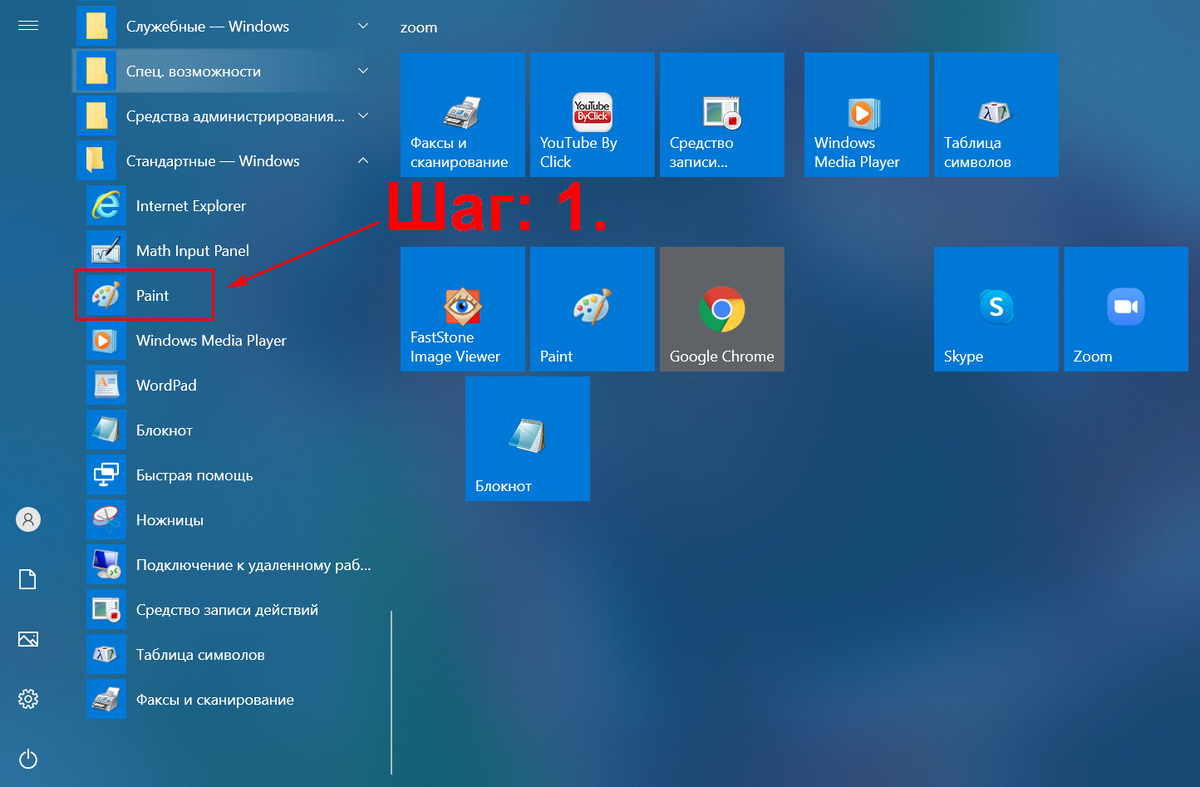 Шаг 1: зайдите в меню «Пуск», опустите ползунок вниз, откройте папку «Стандартные» и выберите программу «Paint ».