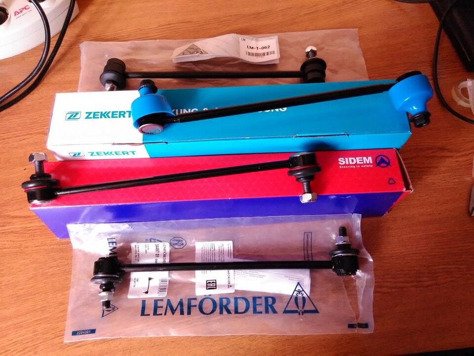 В данной записи представлен фотообзор указанных стоек стабилизатора , фото с моими примечаниями приведены ниже. Предварительный вывод — все импортные стойки сделаны аккуратно , тогда как отечественное изделие сделано более неряшливо, и я даже посвящу ему отдельную запись. Шарниры у всех стоек перемещаются плавно, без заеданий, получше у CTR, Lemforder, GMB и Sidem, чуть похуже у Zekkert и Links Master, но я пока не считаю это критичным, т.к. шарниры еще новые и не разработались.