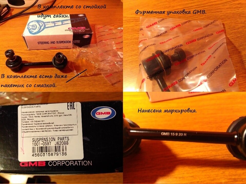 1. GMB (Япония). Известная фирма, делает запчасти, связанные с подвеской, рулевым управлением, водяные насосы. Т.е. шарниры и подшипники — ее профиль. Стойки ожидаемо оказались очень аккуратного изготовления, причем в комплекте зачем-то прилагался пакетик со смазкой.