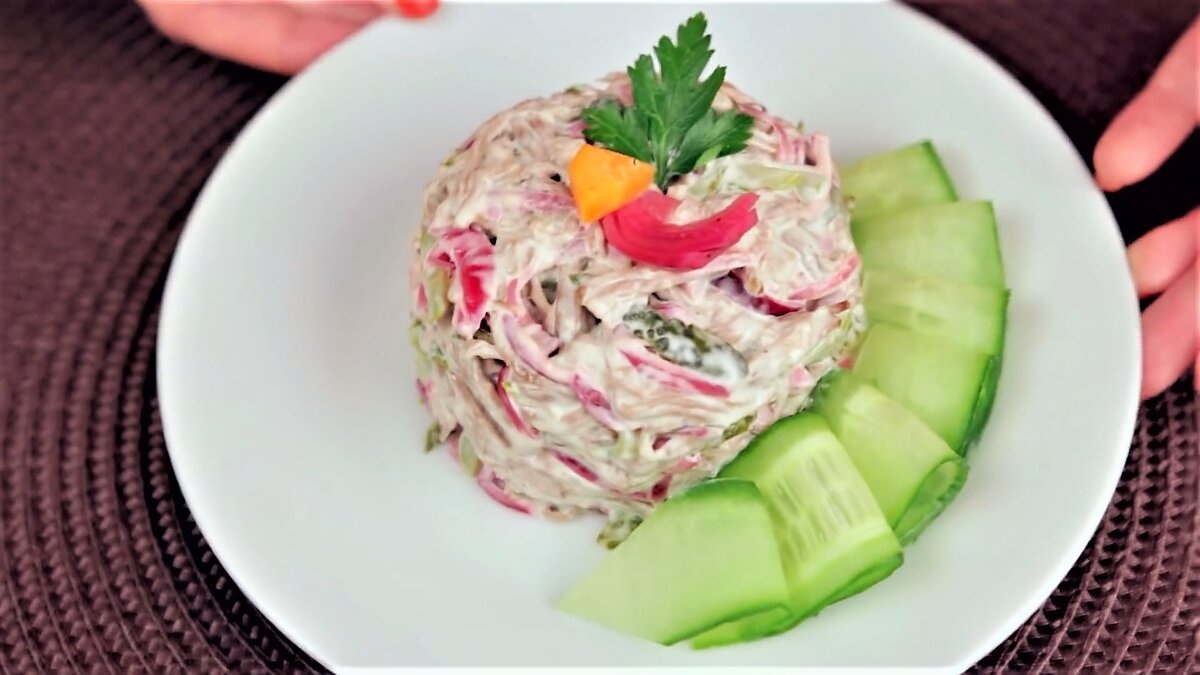 Привет. Сегодня я покажу рецепт одного из моих самых любимых салатов. Это мясной салат. Суть в том, что он состоит из мяса, он очень сытный, очень вкусный и безумно простой. И давайте посмотрим, что для этого нам понадобится.