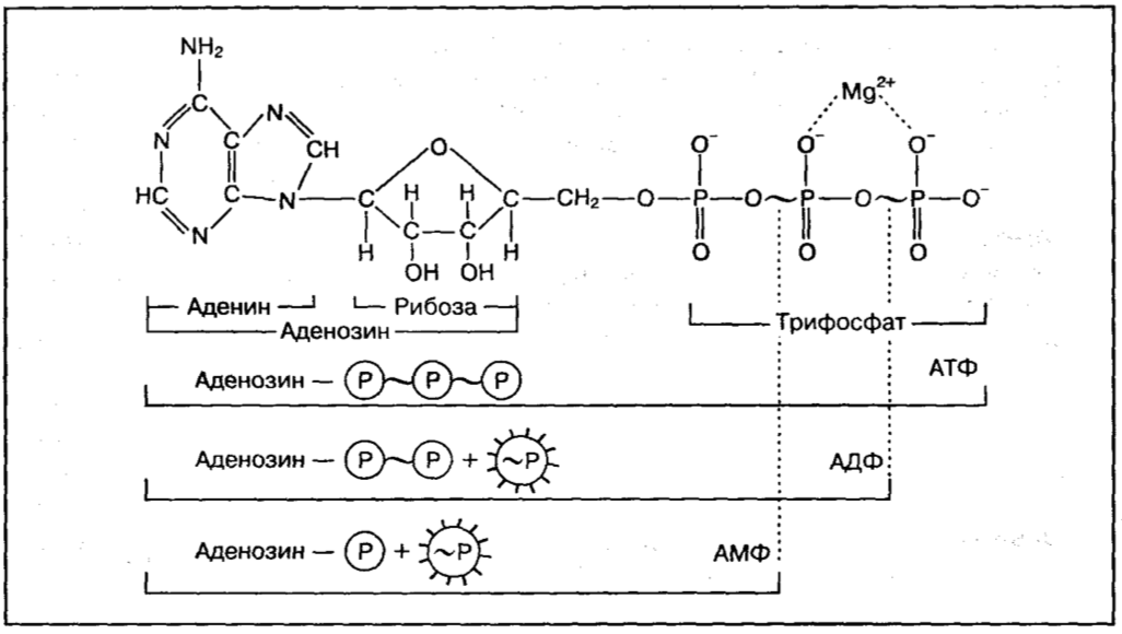 Состоит она из азотистого основания — аденина, углевода — рибозы, которые вместе образуют аденозин, и трех остатков фосфорной кислоты.