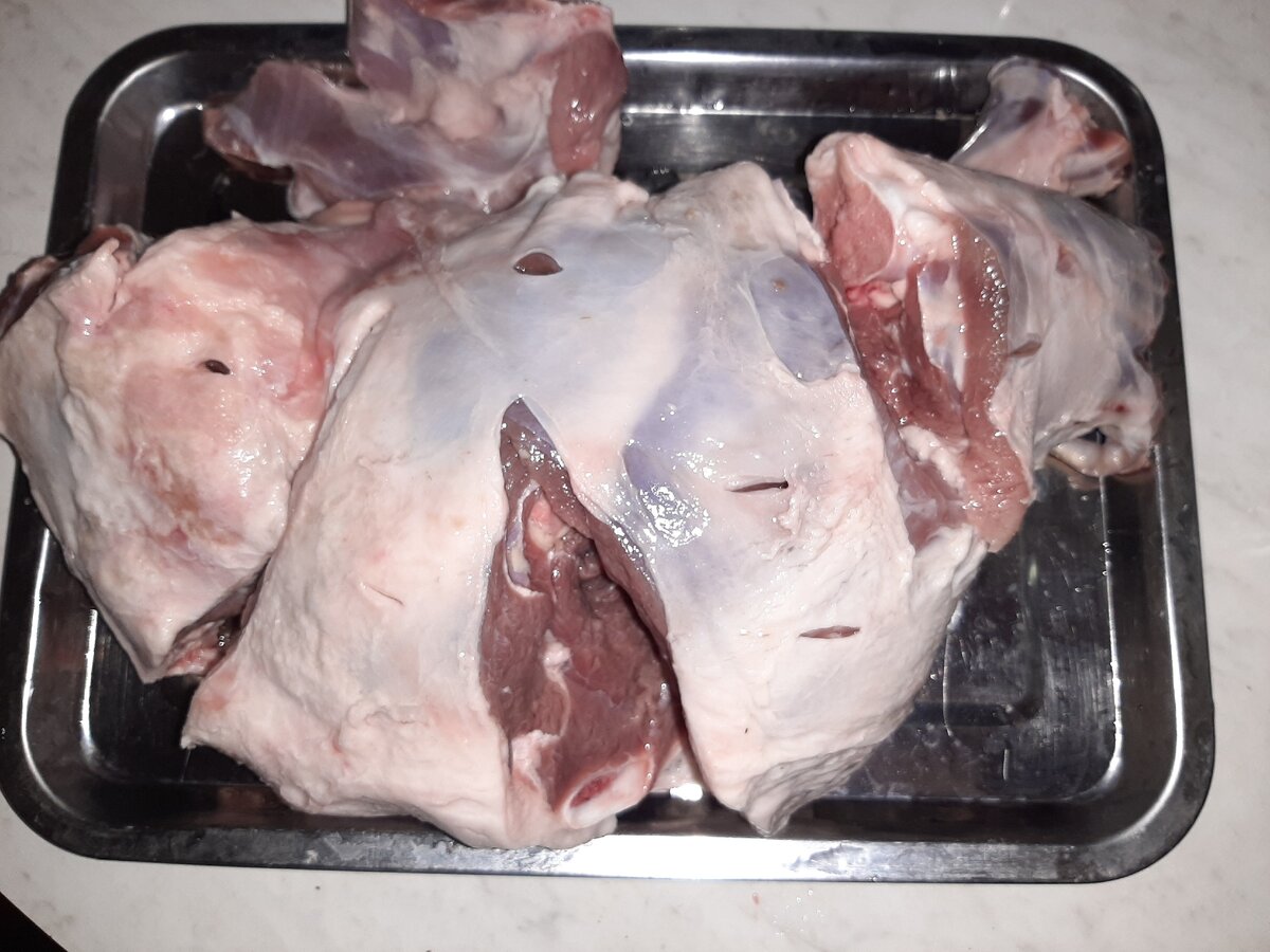 Мясо ополаскиваем прохладной водой и ножом прокалываем в нескольких местах.