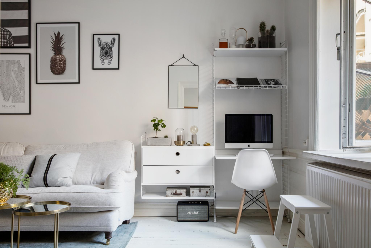 Для общественных пространств действует правило: дизайн — на первом месте. Мы работаем не каждый день, и иногда приглашаем друзей. Тем более в летний сезон. Поэтому при оформлении офисной зоны следите за центром пространства . Необязательно задвигать рабочий стол в угол: если других высоких горизонтальных поверхностей в комнате нет, столешница сместит «центр тяжести» на себя, и пространство визуально дезорганизуется. Также стоит задуматься, прежде чем завешивать стены полками и баррикадировать стену стеллажами. Сегодня проще воспользоваться переносными системами хранения , стильными ящичками или даже коробками: они мобильнее, и в случае вечеринки их проще убрать из поля зрения.