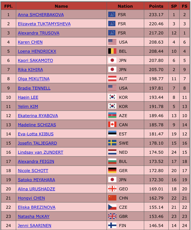 Елизавета Туктамышева, ты настоящая императрица! Триксель с двойным тулупом через тройку, затем красивый триксель. Так обидно упала с тройного флипа. В остальных прыжках была хороша, вновь зажгла своей необычной программой. Боже мой, Лиза, как мы все счастливы за тебя. Спустя 6 лет Императрица вновь на пьедестале. Уверена, каждый всплакнул вместе с Лизой. Такая нетипично сентиментальная Елизавета, такие искренние слёзы, в которых столько упорства и любви к фигурному катанию. Как долго этого ждали любители и эксперты фигурного катания. Как с высоко поднятой головой, верностью своему тренеру, великому профессору Алексею Николаевичу Мишину, и бесконечной внутренней силой шла к этому чемпионка мира 2015(!!!) года Елизавета Туктамышева. Лиза, низкий поклон, это было ФАН-ТАС-ТИЧ-НО, спасибо! Протокол: