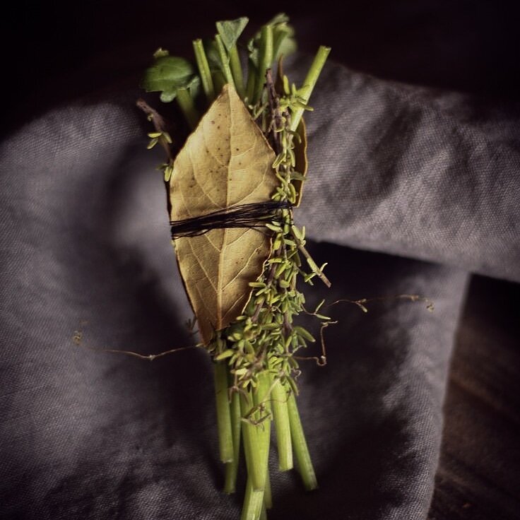 Классическое сочетание - лавровый лист, тимьян и петрушка; так же это может быть шалфей, розмарин, и иногда специи - гвоздика или душистый перец.