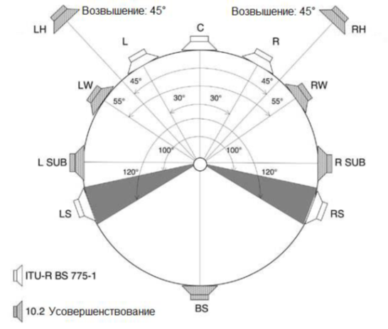 Рис. 3.1. Схема расположения громкоговорителей в формате 10.2 и ее связь со схемой, приведенной в рекомендациях ITU-R BS 775-1, касающейся формата 5.1