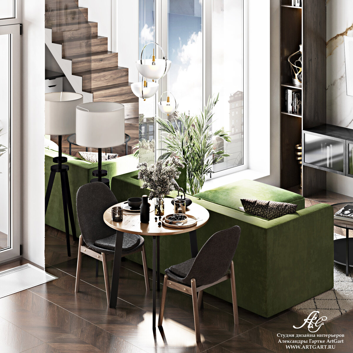 Двухуровневая квартира! Потолки в квартире площадью 38 квадратных метров 3.70. Чтобы добавить пространства, решили сделать второй уровень, антресольный этаж, итого получилось 50 метров😉 В квартире очень красивые большие окна! Мы предусмотрели возможность закрывать их полностью, так как выходят они на южную сторону☀️ Кухня совсем небольшая по одной линии с мини-холодильником, так как хозяин практически не готовит дома. Проект получился в экостиле: много живых растений и зеленый модульный диван поддерживают это настроение🌱 На втором уровне разместилась спальня: кровать у стены, прикроватная тумбочка и комод. Из спальни открывается очень красивый вид из окна! Поэтому перегородка, что ведет сюда, стеклянная. Пол сделали единый керамогранит под французскую елку. Рабочее место с большим столом прямо под спальней. Здесь высота потолка 2.10, но это достаточно комфортно. В прихожей стандартный шкаф из IKEA, для него специально сделали нишу. А вы были бы готовы пожертвовать высотой потолков р