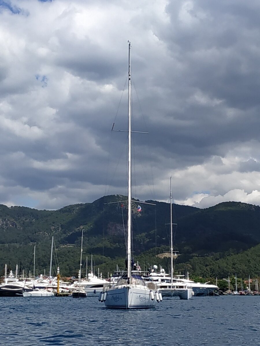 С соседней яхты ребята говорят, что все норм, мне же кривь мерещится. Надо перенастраивать в ближайший штиль. В "Катера и Яхты" капитаны подсказали, как измерять натяжение тросов.