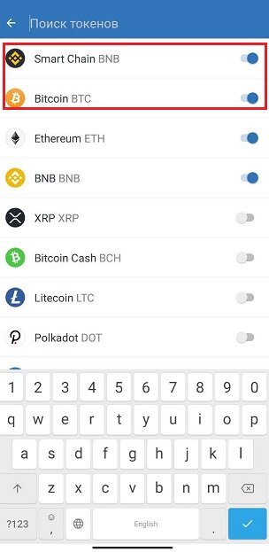 4. Далее необходимо перейти во вкладку фильтр в левом верхнему углу, и добавить монеты PancakeSwapCake и Binance Smart Chain , они нужны чтобы вы могли получить коды кошельков и отправить туда криптовалюту
