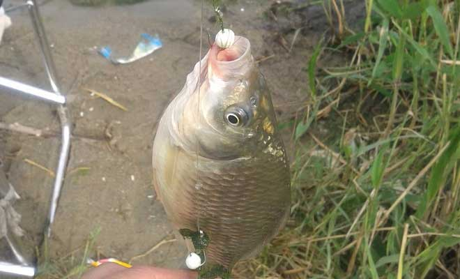 В кормушку набиваем тесто, на крючок надеваем шарик и отправляем на охоту в подводный мир.