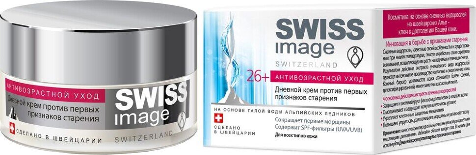Специально с учетом потребностей кожи швейцарская лаборатория Skin Concept разработала новую марку косметики SWISS IMAGE, которая производится из натуральных биологически активных ингредиентов. Нежный крем увлажняет и защищает кожу на протяжении всего дня. Инновационный экстракт снежных водорослей разглаживает первые морщины и предупреждает их появление. Уменьшает потерю эластичности волокон коллагена, сохраняет упругость и молодой вид кожи. Усиливает кровообращение и питание клеток кожи, устраняет тусклый цвет лица. Экстракт коры африканской березы нейтрализует действие свободных радикалов и защищает кожу. Натуральный комплекс, содержащийся в креме, существенно повышает уровень влаги в коже и обеспечивает оптимальный уровень питания и увлажнения на 24 часа. Содержатся SPF фильтры (UVA/UVB). Не содержит PEG (полиэтиленгликоль) и парабенов.