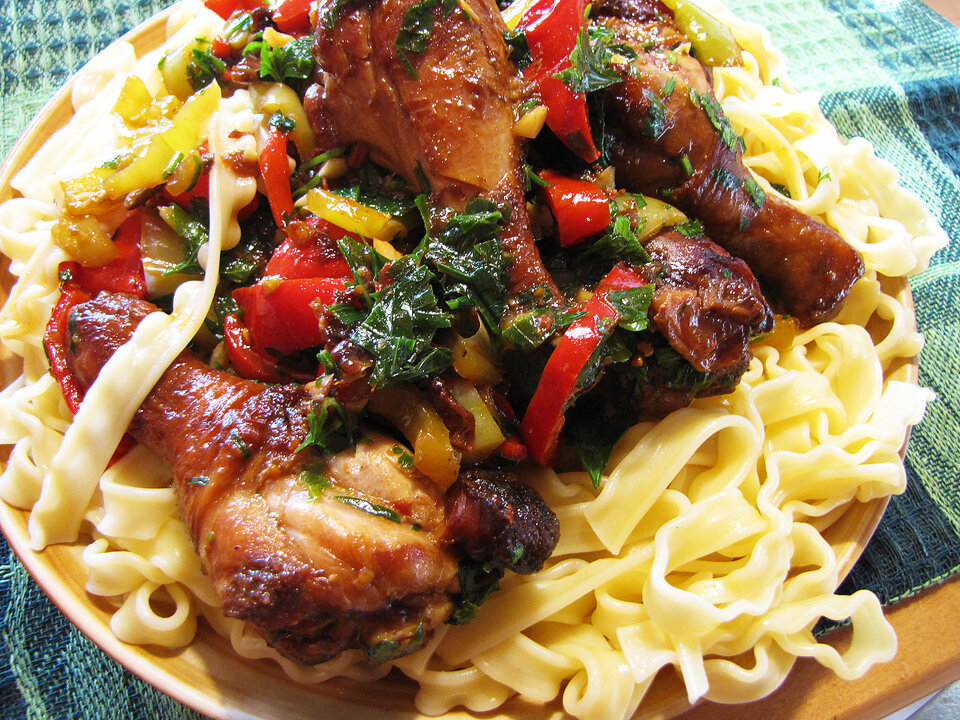Дапанджи вообще состоит из двух частей – курица с овощами и такой своеобразный гарнир. В качестве гарнира может выступать тушёный или отварной картофель, а может – лапша или сочни из теста. Я по некоторым причинам выбрал лапшу, а вы - как хотите. Но начнём с курицы.