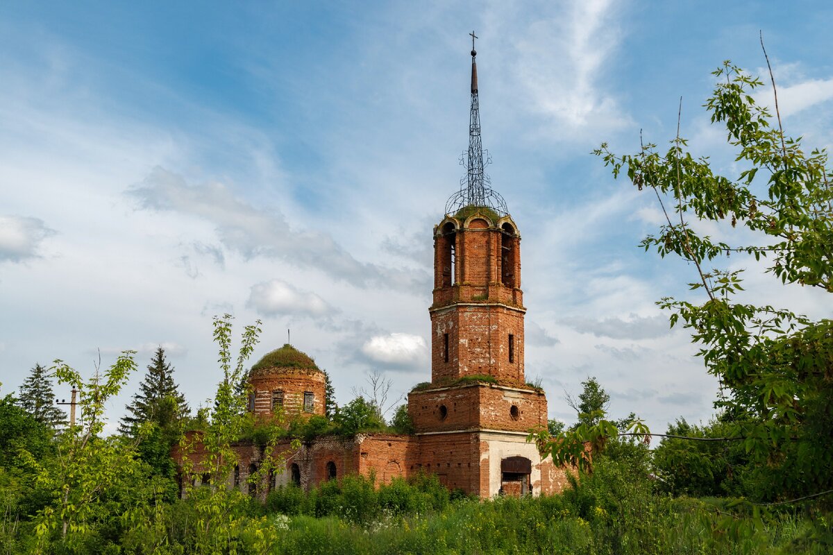 Погуглила об этом месте, оказывается это церковь Рождества Пресвятой Богородицы, построена она в 1844 году. Особой информации в сети я о ней не нашла за исключением того, что, по словам местных, эта церковь не совсем заброшена, время от времени здесь проходят службы. На стенах храма даже сохранились кое-какие росписи. Сомнительно, ведь находиться внутри такого аварийного здания опасно. Да и все вокруг здесь поросло бурьяном, не представляю, как через такие заросли можно пробраться внутрь.