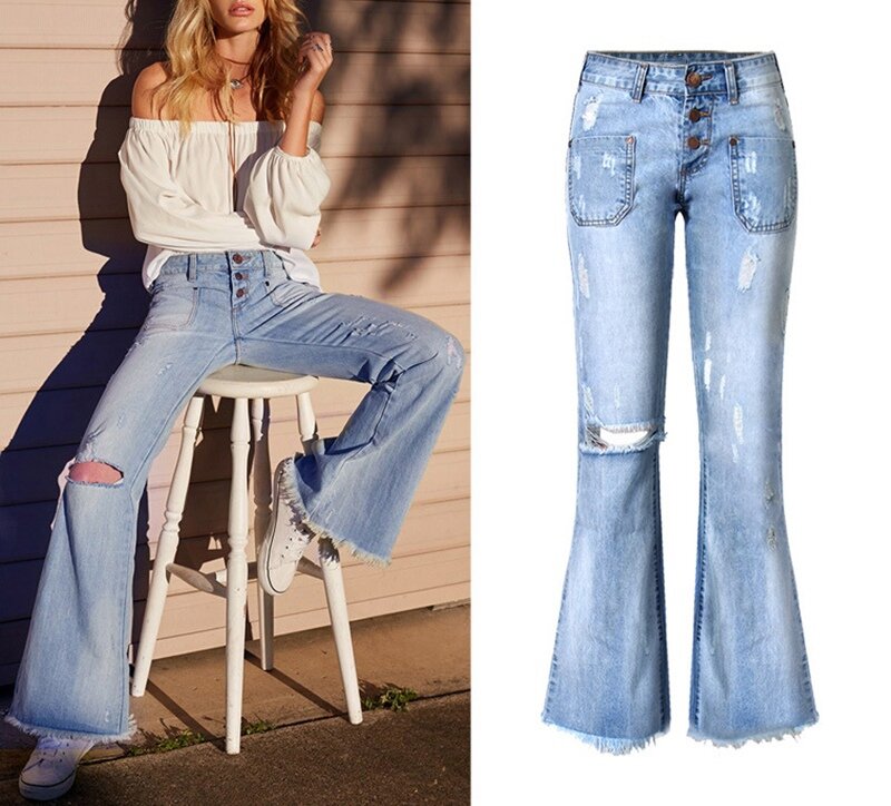 Расклешенные джинсы выбирают многие модели, так как они возвращают свою популярность, которой пользовались в 70-х. Такие джинсы сужают бедра, визуально удлиняют ноги, получается эффект "песочных часов". Джинсы-клеш прекрасно подойдут девушкам и женщинам, которые хотят выглядеть выше, а с сочетанием высокого каблука эти джинсы будут смотреться идеально.