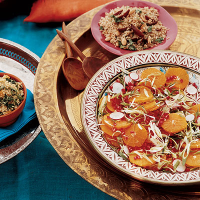 2. Разрежьте гранат пополам и вытряхните семена чайной ложкой. Разбросайте семена по долькам апельсина, затем разбросайте редис и салатный лук по семенам.