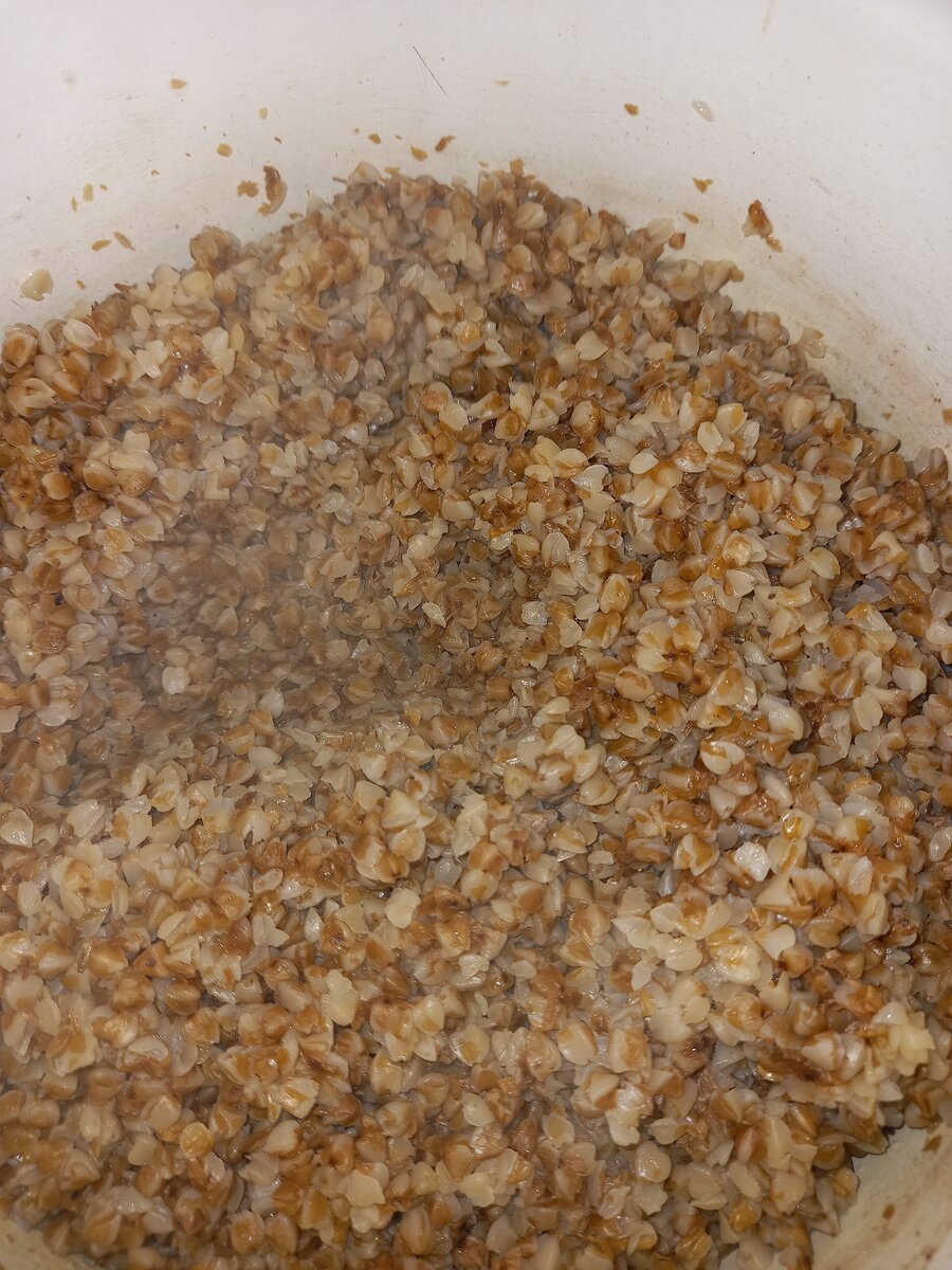 Для начала, как обычно, сварим гречку. При закипании воды солим и наливаем растительного масла, тогда она получится расыпчатая.