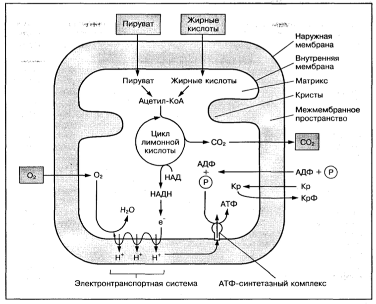 Во внутренней мембране находятся главные ферментные комплексы, участвующие в передаче электронов на кислород (дыхательная цепь) и обеспечивающие процесс окисления.
