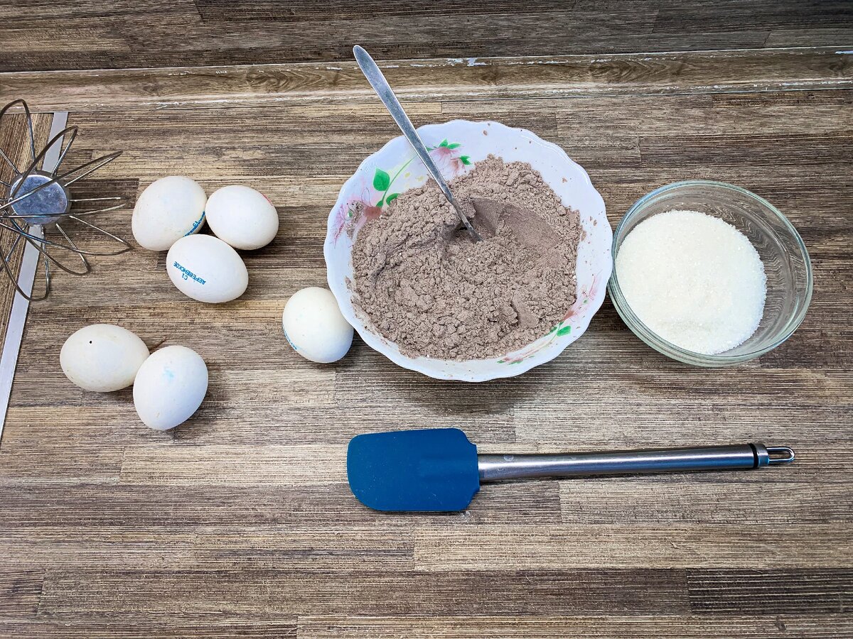 В одной миске просеять муку, какао и разрыхлитель. Яйца должны быть комнатной температуры.
