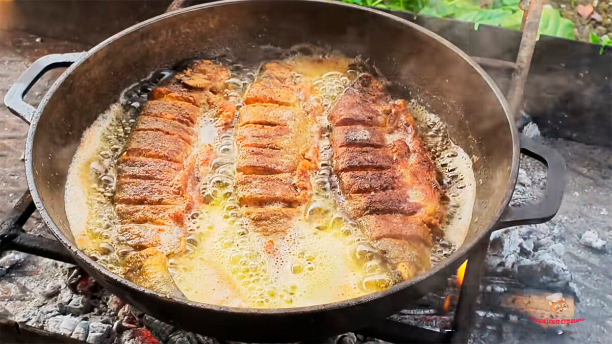 - Перекладываем рыбу на сковороду, и жарим на сильном огне с двух сторон до хрустящей корочки.