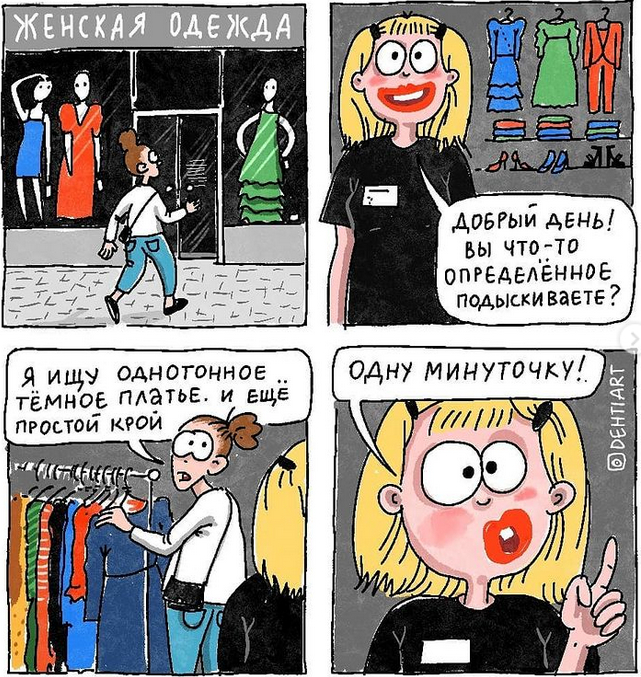 Комиксы Светланы Дехтяр можно смотреть бесконечно. Обожаю ее юмор о жизни молодых девушек и современной моде. Смешные комиксы от этой художницы всегда поднимают настроение. Если вам скучно и хочется приправить свободные скучные минутки отличным юмором, заходите на страничку Светланы →Инстаграм← Именно там мы познакомились со Светланой и пообщались о творчестве. Светлана рассказала, что не считает себя комиксисткой, она гораздо больше увлечена своим проектом "Пишу бумагой", это прекрасная серия работ, где художница создает картины в технике аппликации, о которой на канале ранее уже выходила статья. Сегодня же у нас подборка комиксов о моде и шопинге от Светланы Дехтяр. Если вас тоже забавляют современные модные тенденции, непонятливые консультанты в магазинах и несуразная одежда, приглашаю вместе со мной насладиться комиксами на эту тему. Захватывающий рассказ в иллюстрациях о походе в магазин женской одежды, когда вы с продавцом говорите на разных языках. Просишь лаконичное платье,