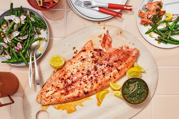 Холодный запеченный лосось с салатом из зеленой фасоли.