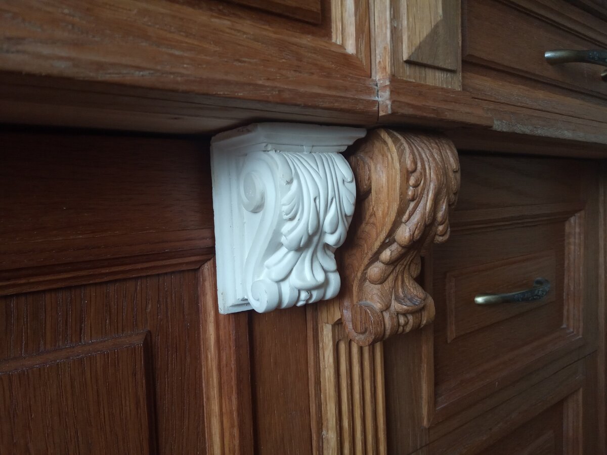 Мне же это пригодилось при изготовлении кухни из массива, в которой по проекту я предусмотрел резные кронштейны под ящичный пояс. Он выходит за общую плоскость фасада и наличие кронштейнов помогало композиционно завершить проект.