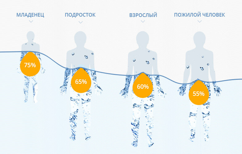 Мышцы человека на 75% состоят из воды. Вода является наиболее важным пищевым продуктом. Дегидратация, или потеря организмом воды, нарушает деятельность сердечно-сосудистой системы, клеточный метаболизм и терморегуляцию.