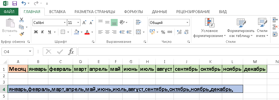 Например, у вас есть строка с наименованиями в отдельных ячейках и вам нужно объединить эту строку в одну ячейку и разделить содержимое запятой.