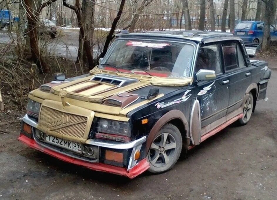 И по традиции начинаем с наших всеми любимыми Жигулях. На фото представлена Ваз-2107 с элементами тюнинга, которые нашли в гараже или были сняты с других автомобилей или найдены где нибудь на