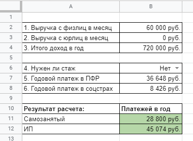 И третий пример, тоже со стажем, но уже с выгодой в сторону самозанятого: