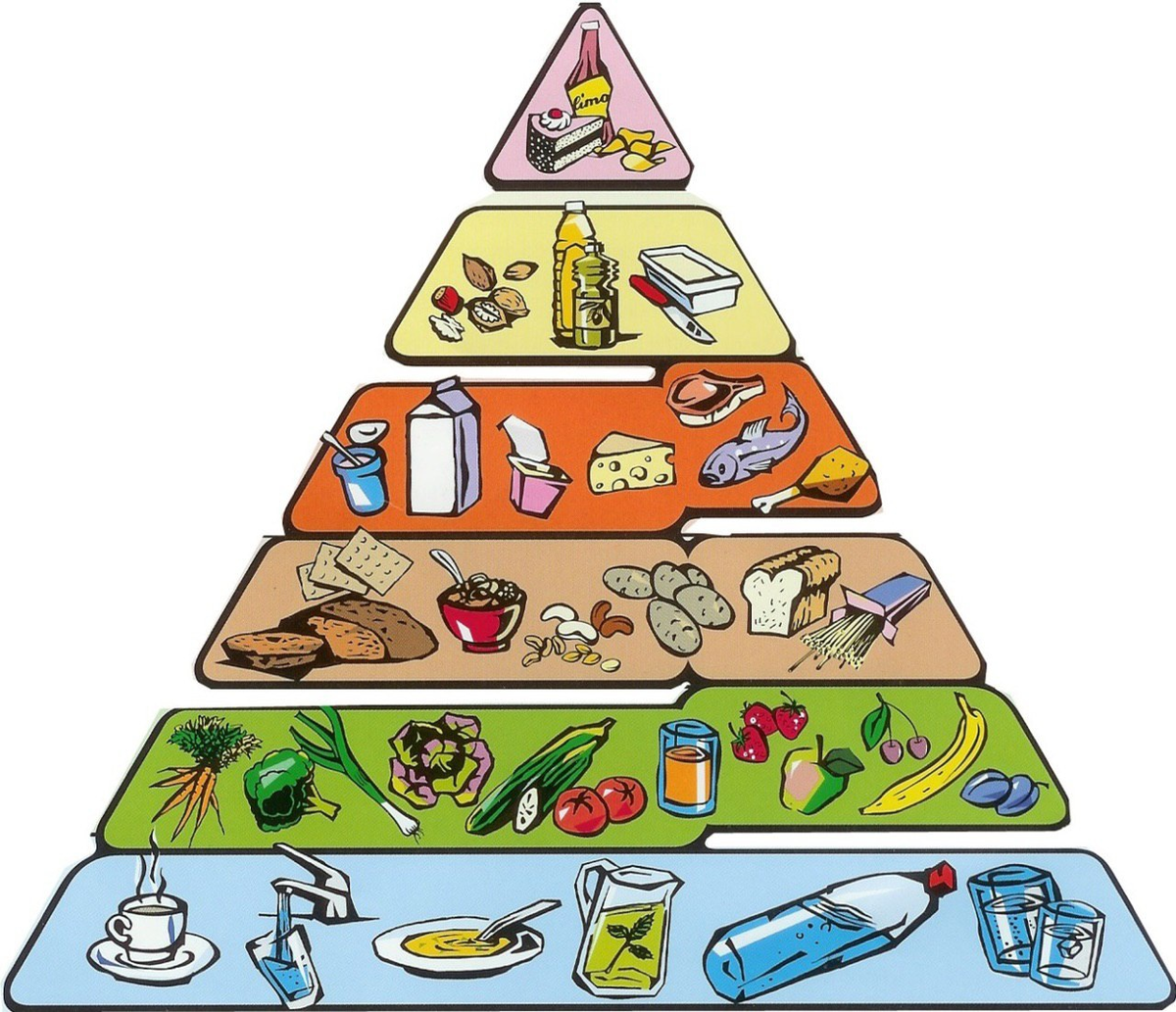 В 1990-х годах специалисты вывели главные правила здорового питания и отобразили их в схеме, получившей название пищевая пирамида. Она состоит из нескольких ступеней, на каждой из которых находятся следующие группы продуктов.