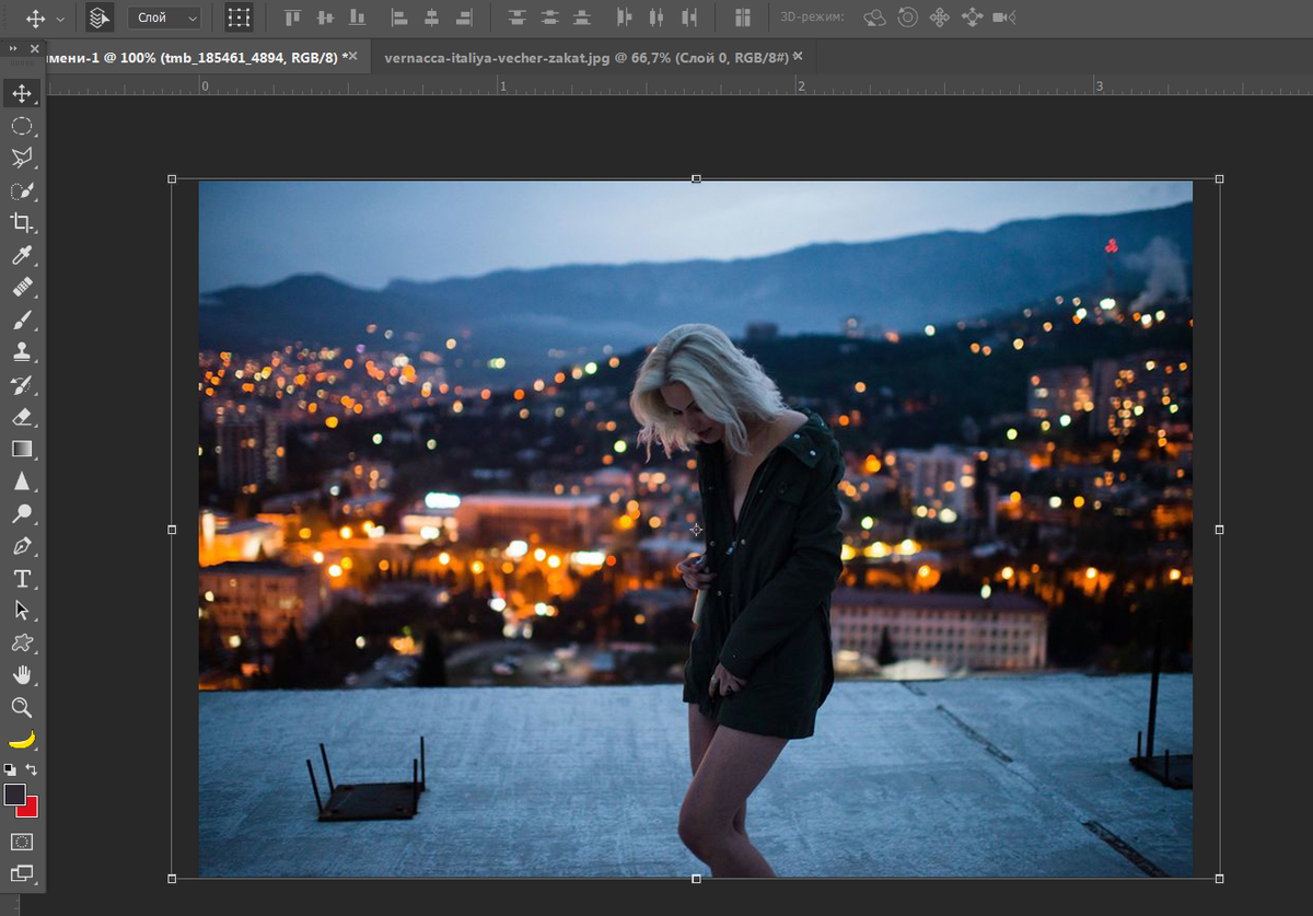 Дальше находим подходящий нам картинку и перетаскиваем ее под слой с девушкой, подгоняем по размерам.