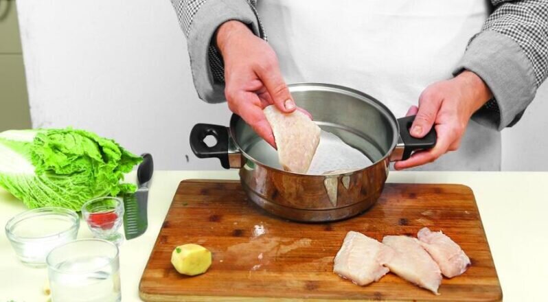 Современные доктора часто говорят, что для того, чтобы у организма были силы бороться с инфекциями, еда должна быть максимально легкой. Перед вами именно такое блюдо. Морской окунь на пару с острым соусом.