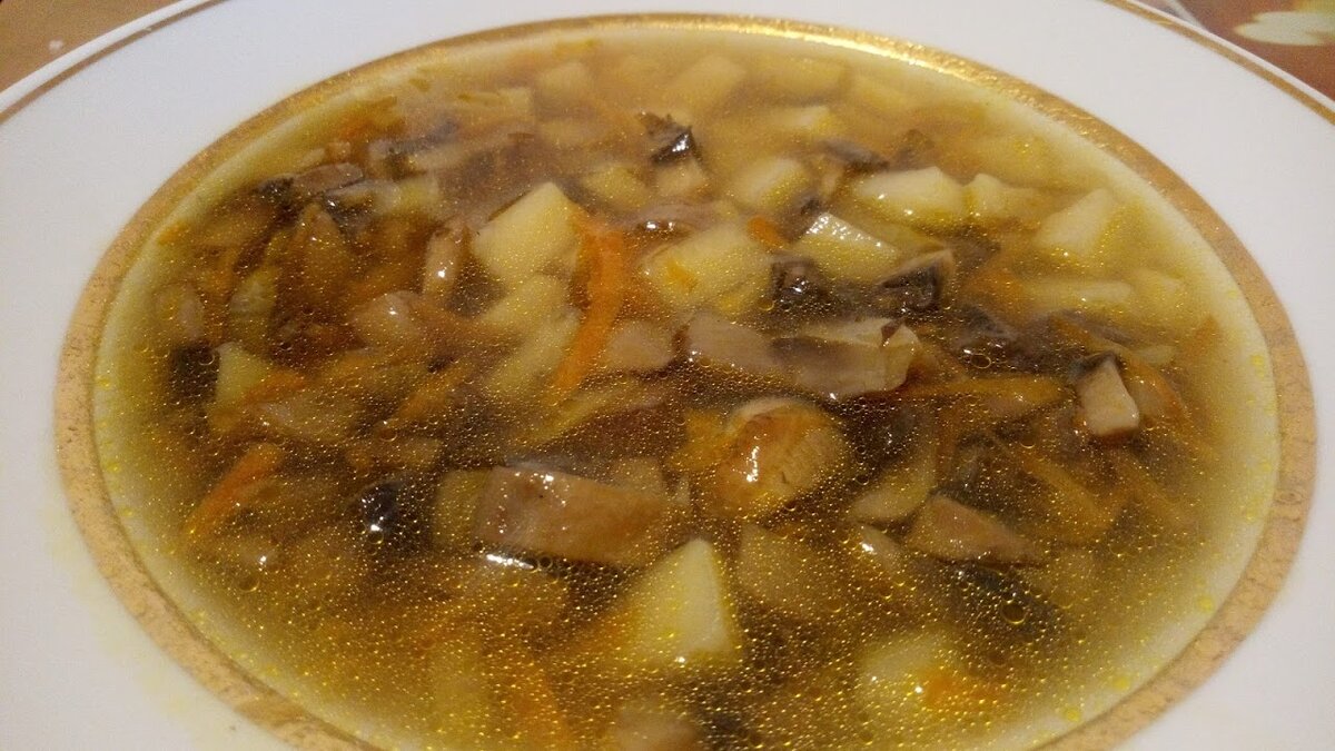 В кипящую воду добавляем грибы, варим минут 15-20. Добавляем картофель, солим и варим до готовности картофеля. Поджарка из лука с морковью добавляется в конце варки. Приглашаем всех к столу!