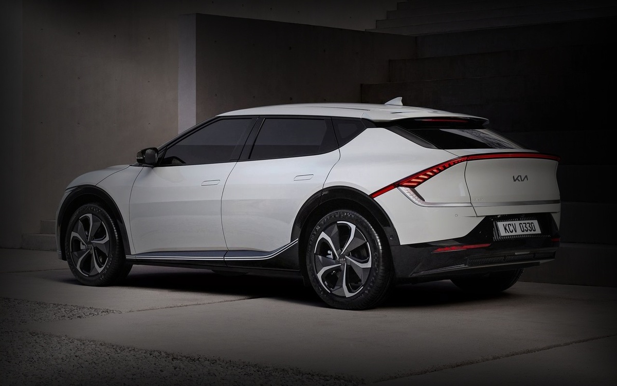 Для бренда это первая серийная модель на архитектуре E-GMP, разработанной специально для аккумуляторных электрокаров. (на ней же построен и Hyundai Ioniq 5). Экстерьер EV6 описывают как сочетание простых и чистых линий с рельефными, постоянно изменяющимися поверхностями. Пропорции кузова сама компания называет кроссоверными. Но при этом в официальном пресс релизе нигде не указан термин SUV. Особенностью дизайна электрокара EV6 можно отметить внушительная колесная база и низкая линия капота, короткий передний свес и приподнятая корма с светодиодной полосой во всю ширину кузова. Элементы оптики EV6 загораются последовательно, создавая уникальную световую подпись.