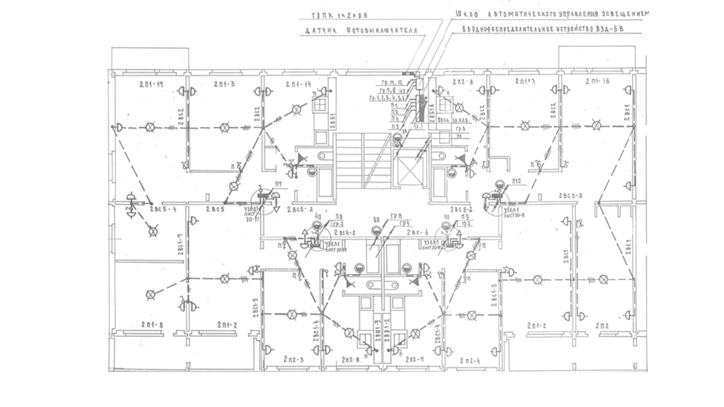 Вот и вся этажная схема проводки в панельном доме. На схеме не обозначен этажный электрощит. Это не ошибка, в зависимости от дома щиты могут располагаться в различных местах.