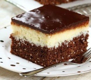 Глазурь делаем из молочного шоколада, по вкусу будет очень похоже на конфеты баунти, так как там тоже кокосовая начинка в молочном шоколаде.Для этого нужно прогреть молоко и залить им шоколад. Покрыть пирожное глазурью. Дать ему полностью остыть при комнатной температуре, а потом поставить в холодильник на два часа.