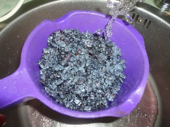 Обязательно нужно хорошо промывать жимолость. Но следует делать это довольно аккуратно в холодной воде, при помощи дуршлага.