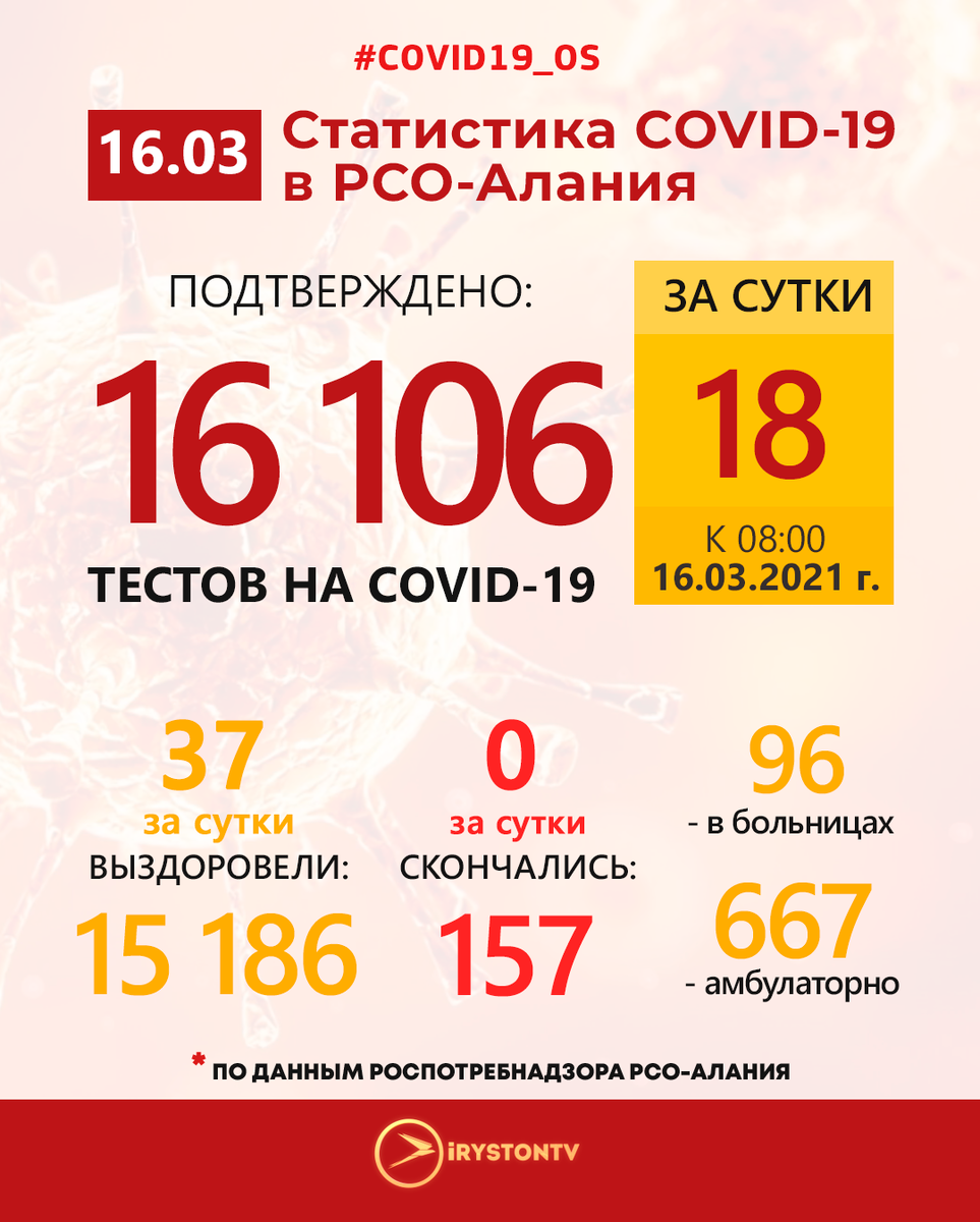 По данным Роспотребнадзора РСО-Алания на 08:00 16 марта 2021 года в Республике Северная Осетия-Алания зарегистрировано 16 106 (+ 18 за сутки) случаев заражения новой коронавирусной инфекцией.