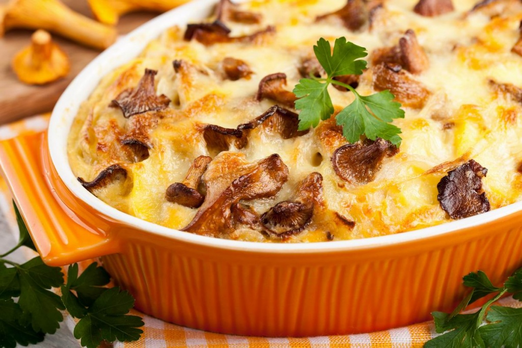 Форму для запекания смазать маслом, выложить слоями: треть пюре, все грибы, снова треть пюре, помидоры кольцами, посолить и смазать постным майонезом , сверху ― последняя часть пюре и майонез. Выпекать запеканку при 180 градусах 30-40 минут.