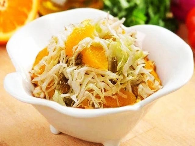 С апельсина трем мелко цедру ― 1 ч.л, сам апельсин чистим от кожуры и пленок. Нарезаем мякоть апельсина средними кусочками. Смешиваем изюм, апельсин и капусту. Заправляем соусом: растительное масло, сок лимона, соль и сахара. Постный салат с апельсинами готов.