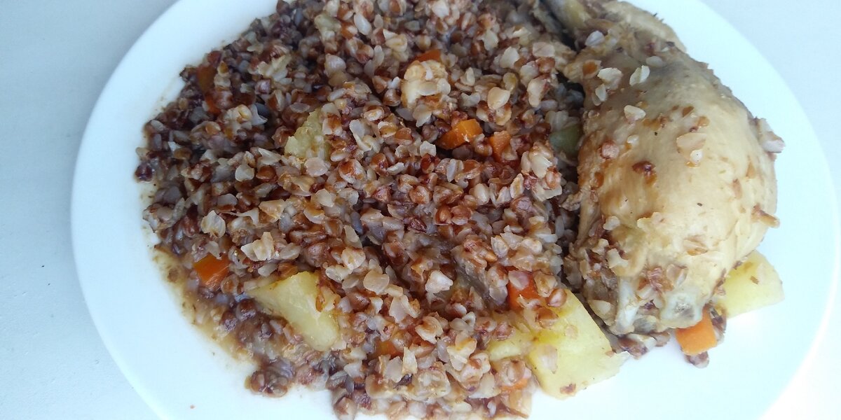 Затем добавляем гречку и снова воды. Готовим на маленьком огне