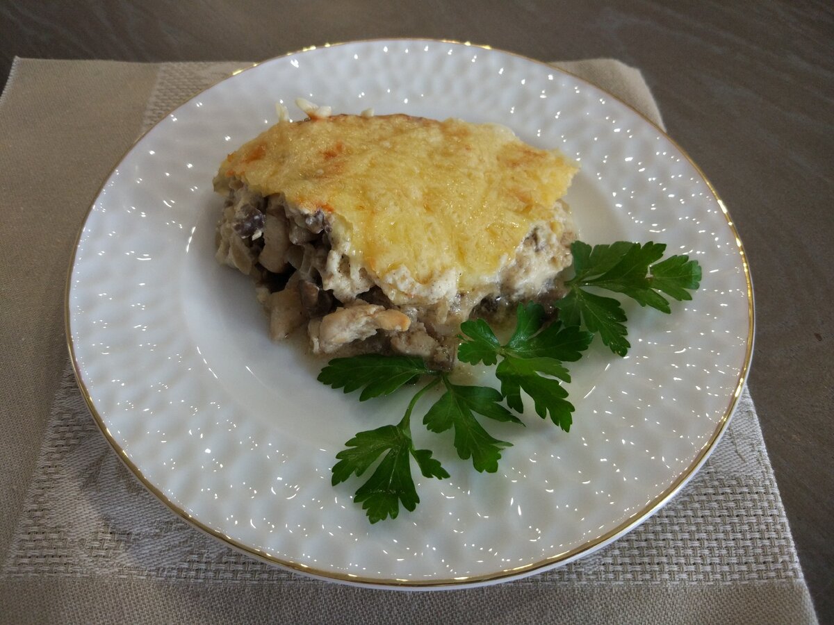 В классическом рецепте надо в соус выкладывать грибы и филе. Но я готовлю по-другому и соусом равномерно заливаю все в форме.