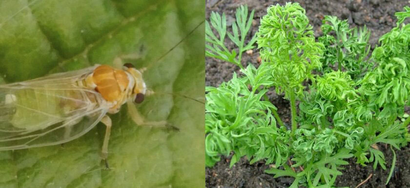 В последнее время на посевах моркови наблюдается такое явление, как скручивание листьев. Эти повреждения вызывает вредитель - морковная листоблошка.
