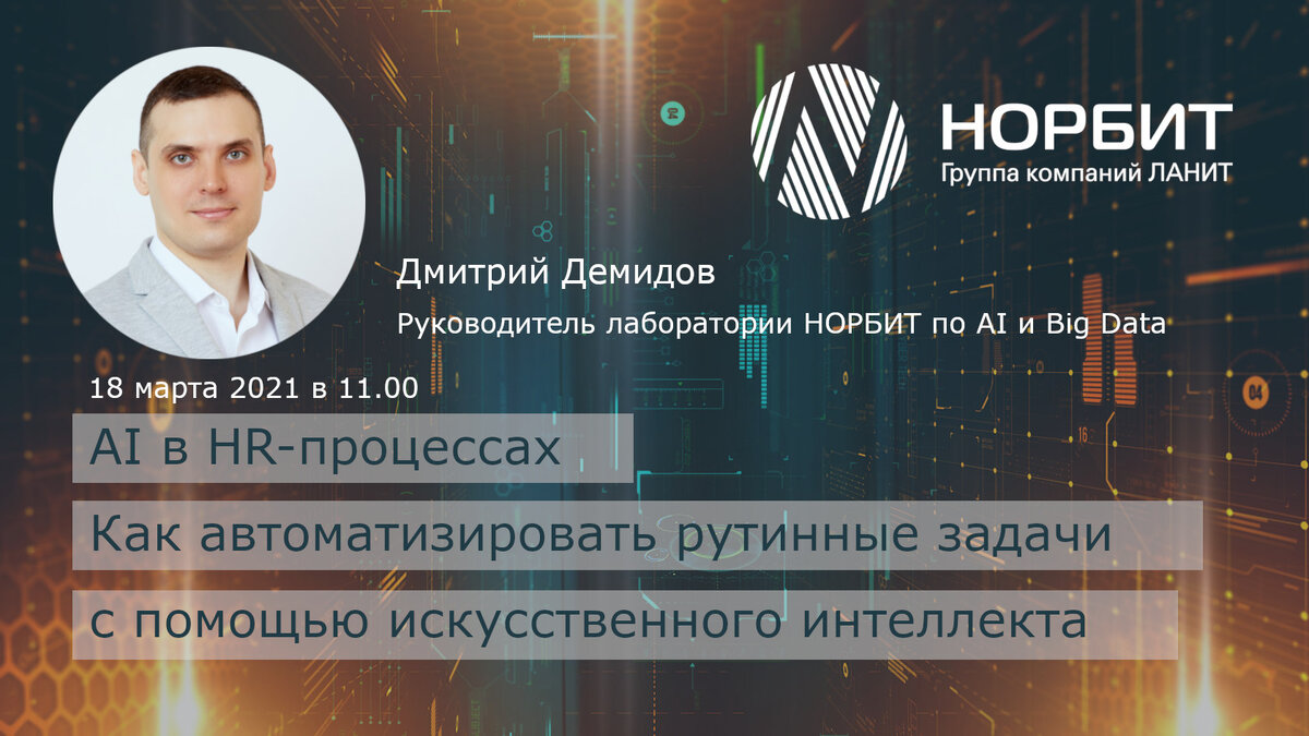 8 марта 2021 г. в 11.00 НОРБИТ приглашает на бесплатный вебинар «AI в HR-процессах. Как автоматизировать рутинные задачи с помощью искусственного интеллекта»