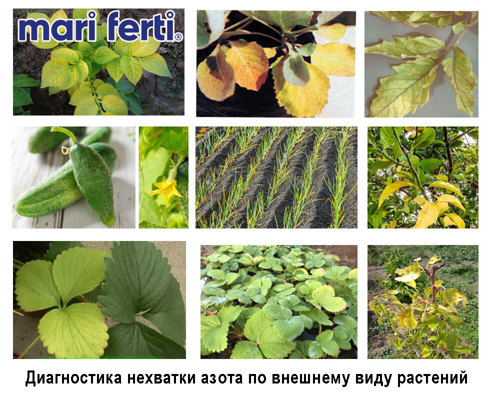 У всех плодовых деревьев первые признаки недостатка азота проявляются в пожелтевших листьях у основания побегов, в задержке прироста побегов. Листья расположены под острым углом к ветви. Листопад наступает рано. Резко уменьшается число цветков и плодов. Побеги коричнево-красные. Плоды мелкие, ярко окрашены.